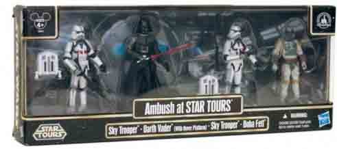 Set includes four fully poseable action figures: Darth Vader (with hover platform and lightsaber) Boba Fett (with blaster and jetpack) and two exclusive Sky Stormtroopers, available only in this set, with weapons and jetpacks! Disneyland Parks exclusive! Includes two Sky Stormtroopers, Darth Vader, Boba Fett, and platform! Fully poseable! Includes weapons and accessories!